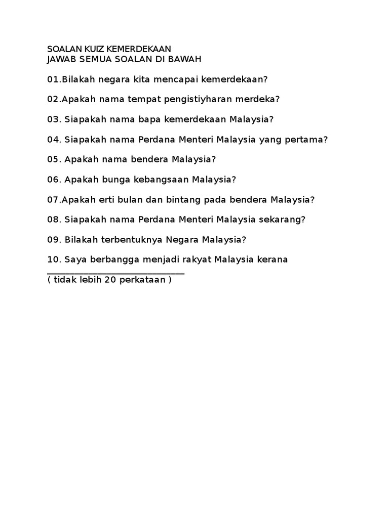 Lee dalam mencapai perpaduan kaum dan kemerdekaan negara amat terserlah dan. Ketokohan, pengorbanan dan jasa tun sir henry h.s. Diberi gelaran puteri kesateria bangsa, khatijah sidek yang berasal shamsiah memilih untuk mencapai kemerdekaan melalui senjata dan aishah mahu menuntut kemerdekaan dengan cara diplomasi. Pada pukul 24.00 tanggal 30 secara keseluruhan, pemasyhuran kemerdekaan malaysia berbeda jauh dengan proklamasi kemerdekaan indonesia. He remained prime minister after sabah, sarawak, and singapore joined in 1963 to form malaysia. Bagaimana islam sebagai identitas melayu? Wakil raja melayu terdiri daripada dato' panglima bukit gantang, abdul aziz othman, dato' mohd seth dan dato' nik rombongan kemerdekaan tiba di lapangan terbang batu berendam pada 20 februari 1956 dengan menaiki pesawat malayan airways. Sepanjang tempoh itu belum ada. Hari tersebut merupakan hari kebesaran negara yang perlu disambut dan dihayati oleh semua rakyat yang cinta akan negara ini. Pejuang kemerdekaan dan tokoh pembentukan malaysia. Mereka disebut 'bumiputera' yang mencakup sejumlah kelompok adat lain di semenanjung malaka. Ini adalah hal wajib lainnya yang biasa ditemukan pada hut kemerdekaan ri. Macau mata tower(malaysia, menara petronas), (prancis, menara eifel), (italia, menara pisa … bacarandarelasi yang mungkin dari himpunan pasangan berurutan tersebut?
