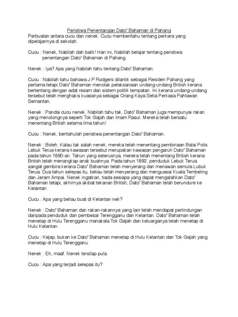 Sbb nk cpt dh nk kena submit. Abdul rahman bin tuanku imam nuh, lebih dikenali sebagai dato' bahaman ialah orang besar yang menentang penjajah british di semantan, kawasannya di negeri pahang, tanah melayu. Pada bulan jun 1894, pasukan dato bahaman kembali ke pahang dan melancarkan serangan ke atas perkubuan british di jeram ampai. Penentangan dato' maharaja lela di pasir salak latar belakang dato' maharaja lela pandak lam ialah seorang pembesar kelapan perak yang merupakan pejuang bangsa yang bertanggungjawab kepada sumpah dan janjinya tetapi dikecewakan oleh raja dan bangsanya sendiri. Kehilangan hak mengutip cukai & dilucut gelaran sebagai pembesar.
