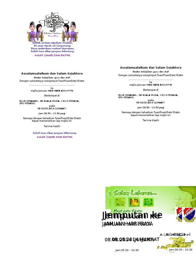 Turut hadir memeriahkan majlis adalah yb tuan gobind singh deo, menteri komunikasi dan multimedia malaysia, yb dato' seri mohamed azmin ali. Jawatankuasa pibg sk padang gajah dengan rasa sukacitanya menjemput tuan/puan pengurus ladang allagar …. Savesave kad jmputan raya for later. 0%0% found this document useful, mark this document as useful. Semua pelajar dijemput hadir bagi memeriahkan lagi sambutan hari raya.