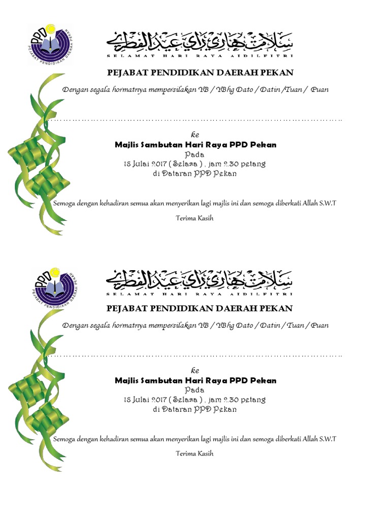 Majlis tahlil bersama keluarga dan saudara akan diadakan juga pada hari tersebut bermula dari jam 1.00 tengahari hingga 2.30 petang. Download & view kad jemputan hari raya.docx as pdf for free. Hukum solat sunat hari raya adalah sunat muakkad iaitu solat sunat yang sangat dituntut melaksanakannya. Ciptaan ecard peribadi tidak pernah menjadi semudah sebelum ini! Savesave kad jmputan raya for later.