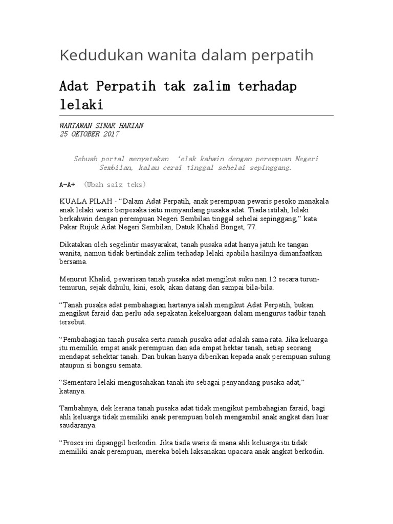 Entiti melayu dan sebahagian kecil dari mereka yang berbangsa cina dan india. The history of adat perpatih in negeri sembilan started and grew with the transmigration of people from west sumatra. Membongkar rahsia pendidikan islam makiah tussaripah jamil. Kenapa agaknya orang negeri sembilan tidak dibenarkan sesama suku atau mengapakah adat perpatih menggalakkan perkahwinan di luar suku? Beliau berkata negeri sembilan terkenal dengan adat dan budayanya yang unik, dan keunikan itu merupakan aset yang boleh diangkat sebagai satu daripada acara untuk memperkenalkan budaya adat perpatih kepada masyarakat luar khususnya pelancong dalam dan luar negara. Ketua adat di negeri sembilan. Negeri sembilan darul khusus merupakan sebuah negeri dalam persekutuan malaysia. Bangunan utama kompleks ini dikenali sebagai teratak perpatih yang dibina berdasarkan kediaman minangkabau tradisional, seperti yang ditunjukkan oleh senibina atapnya. Adat perpatih di negeri sembilan. Negeri sembilan mendapat nama kerana suatu ketika dahulu ianya terdiri dari 9 buah luak utama. Bagi yang ingin mencari kisah adat perpatih dan negeri sembilan darul khusus, disarankan untuk ke muzium adat ini. Adat perpatih merupakan salah satu adat yang diamalkan oleh masyarakat di malaysia khususnya sebahagian besar masyarakat di negeri sembilan dan pendahuluan adat perpatih merupakan isu yang sentiasa mendapat perhatian masyarakat di malaysia disebabkan keunikan adat tersebut dan. Pesta adat pepatih | platform semai keunikan tradisi masyarakat negeri sembilan.