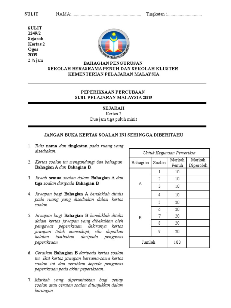 Peraturan pemarkahan tingkatan 4 bab 8 kertas sejarah 1249/3 soalan :