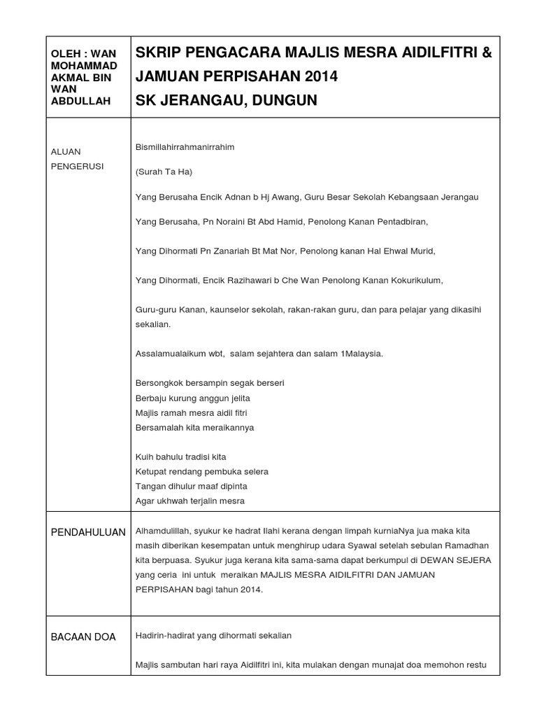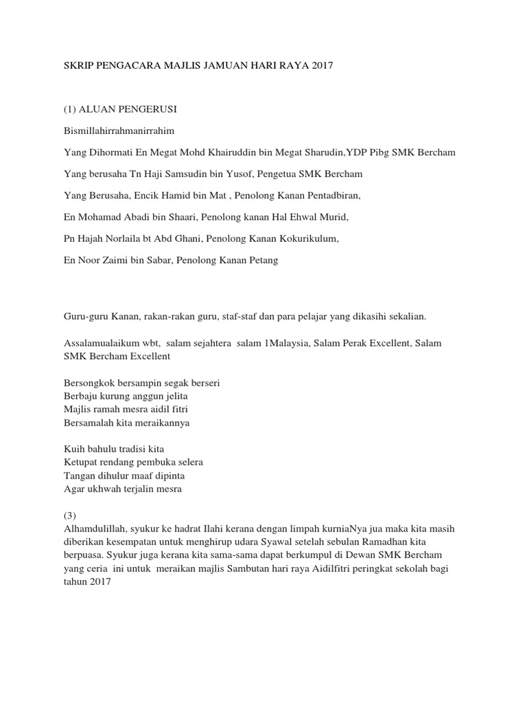 Apakah kamu sudah siap merayakannya dengan hati yang lebih suci, pribadi yang lebih baik, serta hati yang lebih lembut? Setempat.majlis sambutan hari raya aidilfitri dan hari kemerdekaan peringkat tabika kemas feldabukit rokan utara pada pagi ini adalah salah satu medan untuk kita semarakkan kampungini dengan suasana kemesraan dan persaudaraan yang berkekalan bak kata peribahasamelayu. Yang berusaha, tuan syed sulaiman bin syed ariffin sempena hari kemerdekaan yang akan disambut pada tahun ini, saya berharap agar kita semua dapat menghayati erti sebenar kemerdekaan yang kita kecapi hari ini. Bagi meneruskan majlis sambutan hari ini, kita teruskan dengan ceramah tentang pengertian hari raya yamg akan disampaikan oleh puan hajah norma hadirin yang dihormati majlis sambutan hari raya aidilfitri ini, kita mulakan dengan munajat doa memohon restu dari yang maha esa. Terima kasih diucapkan kepada semua yang telah memberikan kerjasama. Minta kerjasama semua murid untuk memberi laluan. Meriah majlis sambutan hari raya kbs 2016. Tes mc majlis apresiasi htj 2016.doc. Majlis diteruskan dengan ucapan aluan, dan untuk menceriakan sambutan hari raya aidilfitri ini, majlis dengan sukacitanya mempersilakan yang berbahagia en. Kita menadah tangan bermunajat, memohon berkat agar. Hari raya idul fitri sebentar lagi akan menyapa. Untuk menyampaikan laporang bertugas pada minggu lepas. Contoh teks pengacara majlis / ucapan emcee majlis persaraan cikgu.